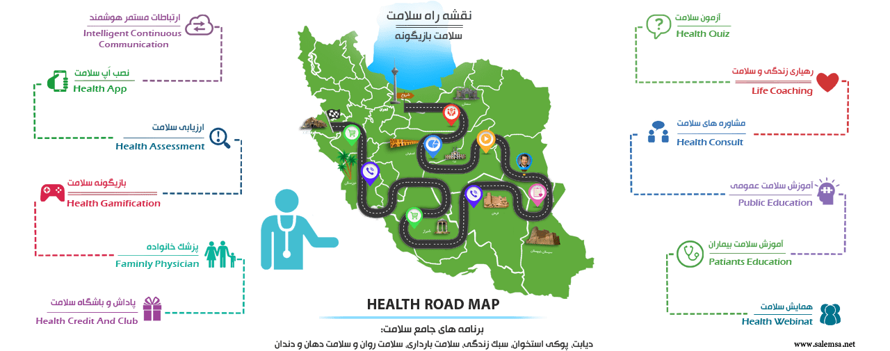 هر نقشه راه سلامت، مجموعه از خدمات سلامت از جمله ارزیابی سلامت و بازخوردهای هوشمند، مشاوره های سلامت، آموزش، ارسال پیام، عضویت در شبکه اجتماعی، دانلود اپ موبایل و … می باشد که در یک موضوع مشخص پزشکی، بصورت ایستگاه هایی به کاربر ارائه می شود. ساختار نقشه راه، به شکل یک فلوچارت هوشمند از ایستگاه ها می باشد؛ نتیجه کاربر در هر ایستگاه، چگونگی مسیر را در ادامه آن، مشخص می نماید. به این ترتیب، خدمات به هر کاربر، متناسب با نیاز او و بصورت شخصی سازی شده (Personalized) ارائه می شود.